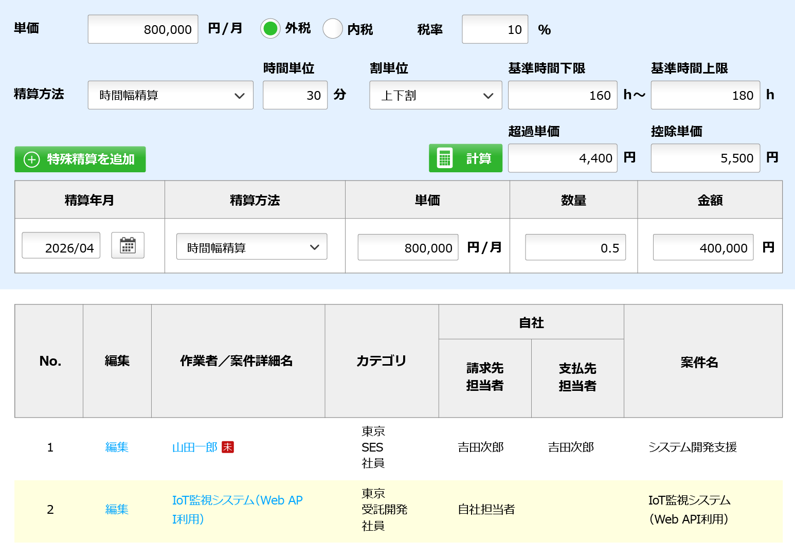 特にSESは、他の契約形態と比べて時間幅精算や特殊精算といった例外条件が多く、入力・請求計算の仕様が運用負荷を左右するため、SES契約を前提に無理なく回せる設計のシステムを選ぶのがおすすめです。